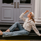This cropped fleece-style jacket features a zip front, long sleeves, and a collared neckline for added structure. The relaxed fit and front pocket detailing make it a versatile layer for transitional seasons and everyday wear.